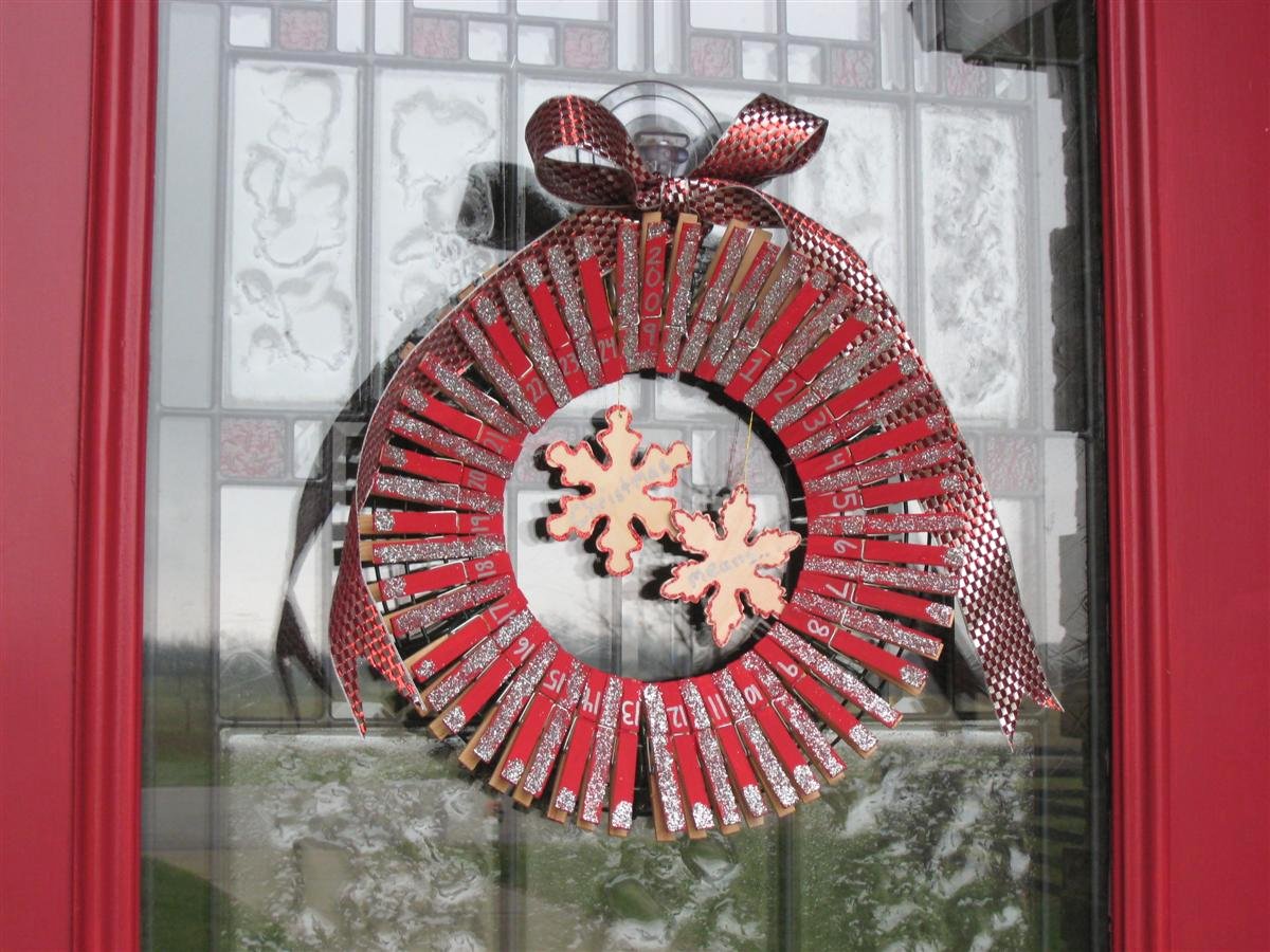 Clip the clothespins onto the wreath, alternating between numbered ones and solid red ones. You should have a gap left that you can fill with four or five solid red clothespins. That’s okay, these will be at the top and will look fine.