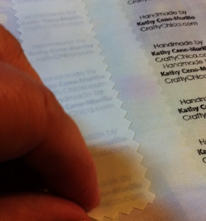 Next, you’ll need to design your label. I needed really tiny labels for my fabric collage scarves, so that is why I went with this size. You can get super fancy, but I just wanted wording, so I used my trusty Word program. I spaced out my labels to give me room enough to cut in between. After you design your label, insert the photo transfer sheet in your printer with the stripe/paper backing facing out.