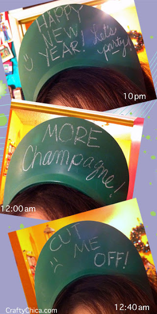 Directions: Spray the visor with the paint, let dry, add two more coats. You can add a little piece of Velcro to the chalk to attach it to the base of the visor, or you can just carry it in your purse. This way you (and your guests) can keep everyone updated on how you are feeling throughout the night!