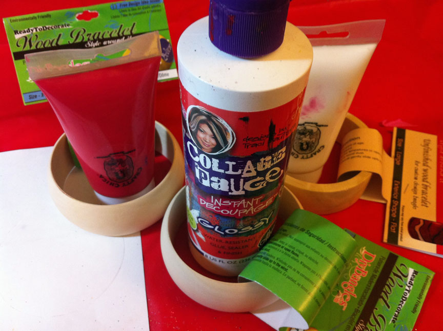 First you need some blank wood bracelets from the craft store, paintbrushes, Crafty Chica® paints, Collage Pauge® Instant Decoupage, Aleene’s® Spray Acrylic Sealer™.