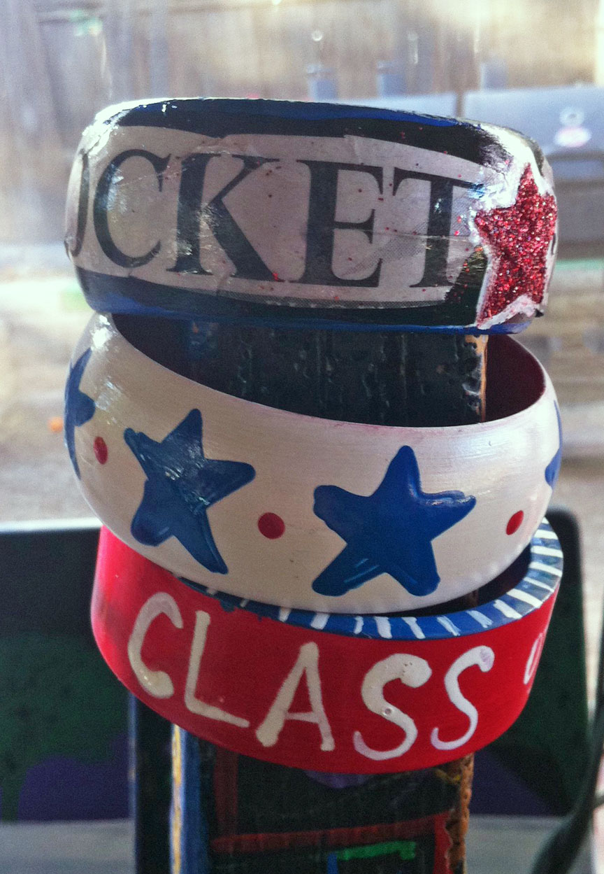 For the second bracelet, I added painted stars and on the third I wrote “Class of 2011.” Let them dry outside and then spray them with the acrylic sealer. I used the super glossy. You can also use the Collage Pauge.