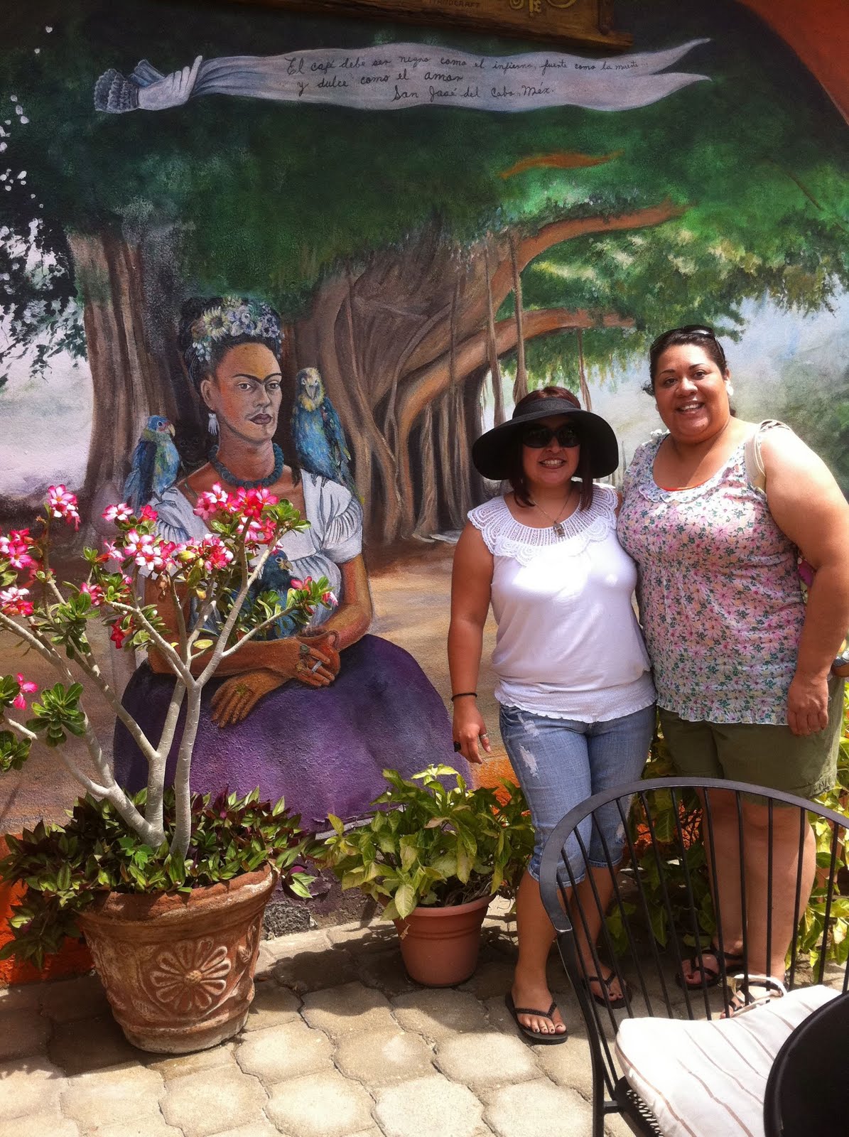 This is the patio area of the outdoor coffee house, it has a huge mural of Frida and the entire place is covered in jungle-type vines!