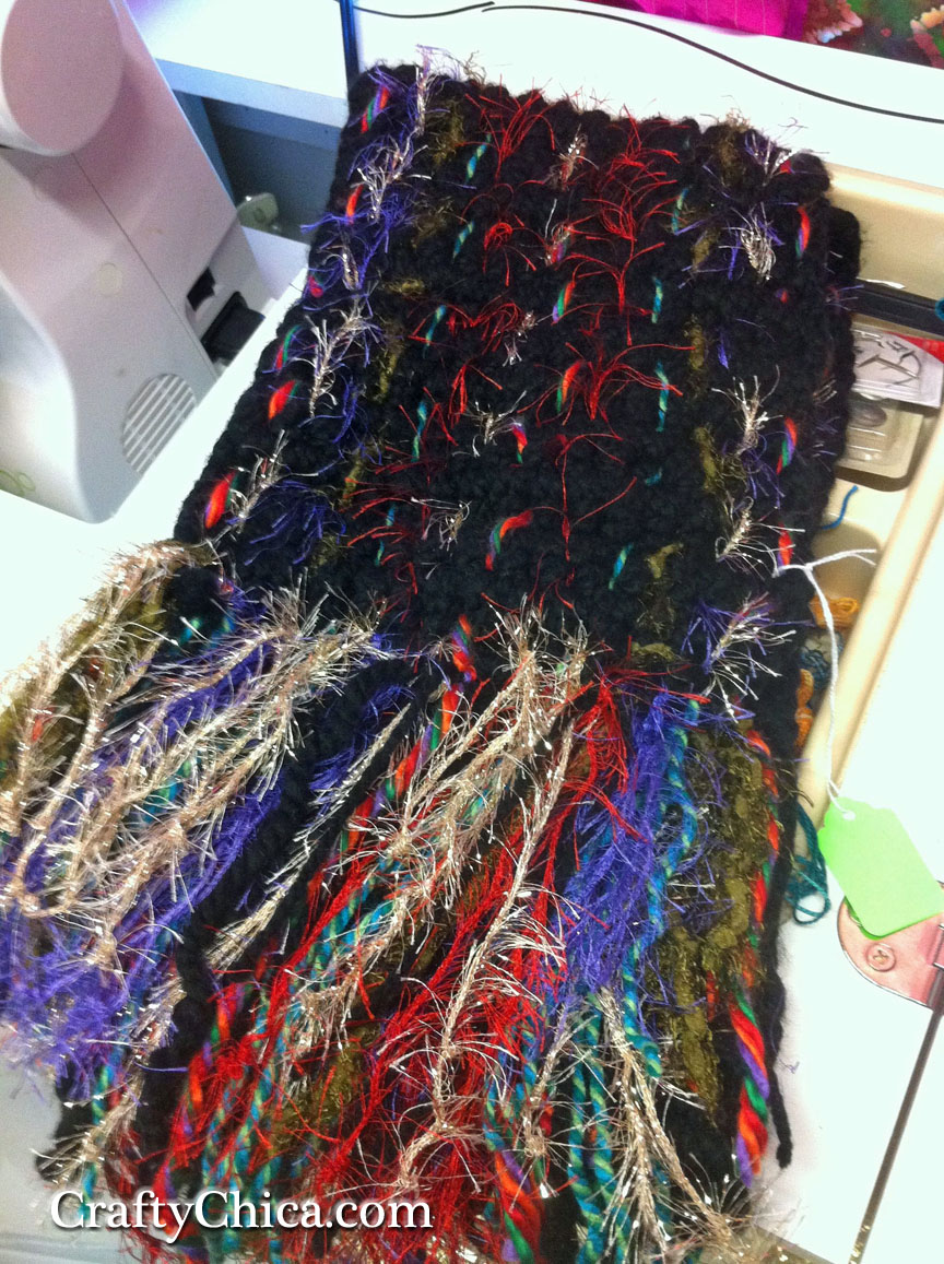 I don’t know what’s come over me – I can’t stop crocheting! I think it’s because I just came off of making a LOT of art pieces for events and for work and there is something so healing and nesting about crochet. I’ve lost count of the scarves I’ve made. I call them “sparkle scarves” because I weave them with shimmery farbics and trims and yarns. I actually only have TWO left, I sold all the others!