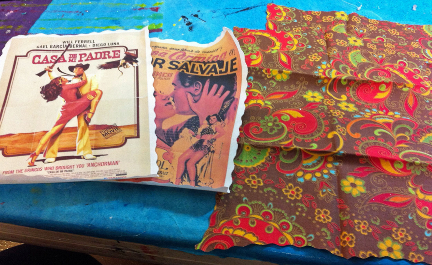 Iron image to white fabric according to package directions. I wanted my pillow double-sided so I used another vintage Mexican movie poster. Cut fabric to use as the background for the posters.