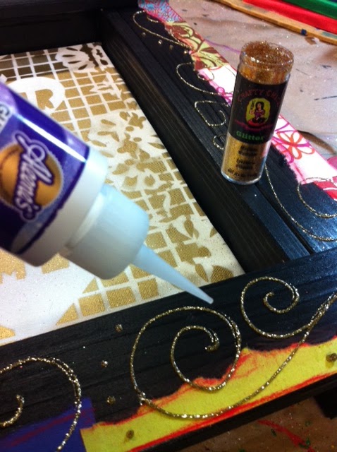 I also used it on the Frida portion of the canvas. I cut the stencil, used spray paint, let it dry and then brushed the Paper Glaze and added glitter, section by section. Let it dry and brush away the excess. I then used a can of compressed air to remove glitter flakes from the background of the canvas.