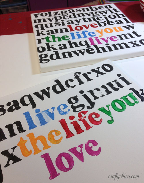 Before you start stamping, decide on your message and lay it out so you know where to and where not to stamp the black lettering. Start at the top of your canvas. Use a paint brush to pat the paint on the stamp and press in place. Add random letters, try to line them up evenly in a row. Keep going. When it comes time to add the words, use a bright color!