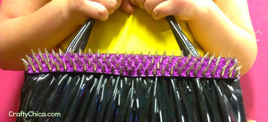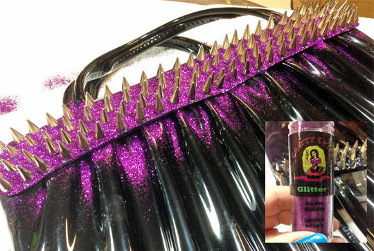 All you need are four supplies: A granny handbag, about 200 7x14mm spikes (I bought mine on eBay for $6), a super strong clear glue for non-porous surfaces. I used Max Tacky Adhesive. Optional: Glitter. You can leave just the spikes, but I wanted to give my project my own “chica twist” so I added purple sparkle!