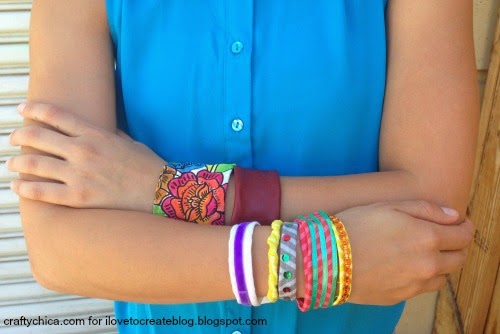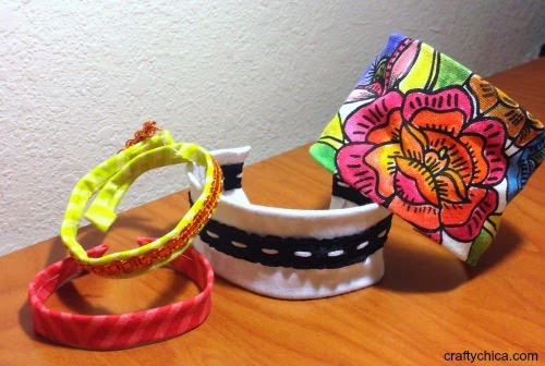 This project started as fabric twist ties and morphed into these crazy wired wrist candy! They are easy to make and fit every size wrist. You can make them long and skinny to triple wrap them around your arm or make a giant cuff. The idea is to glue the wire to the fabric, super simple!