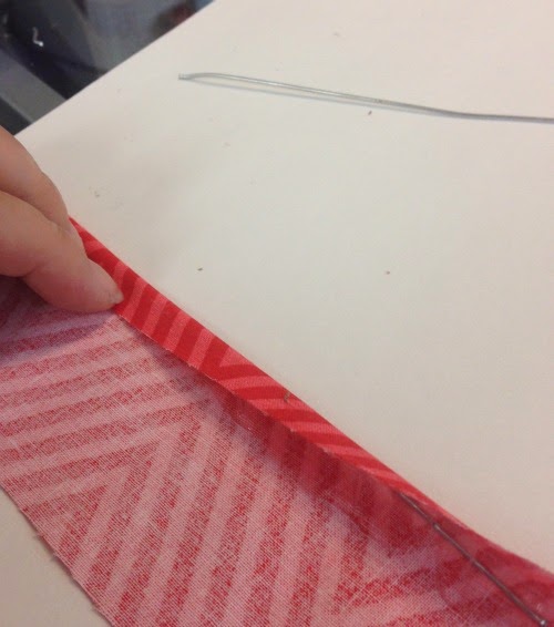 Cut a piece of fabric the length to fit around your wrist and your desired width. Do you want a chunky look, or a skinny look? Cut two pieces of wire just a bit shorter than the fabric. (For chunky, you’ll need to add wire to the top and bottom, for skinny, just in the center.) Add a line of glue along the edge.