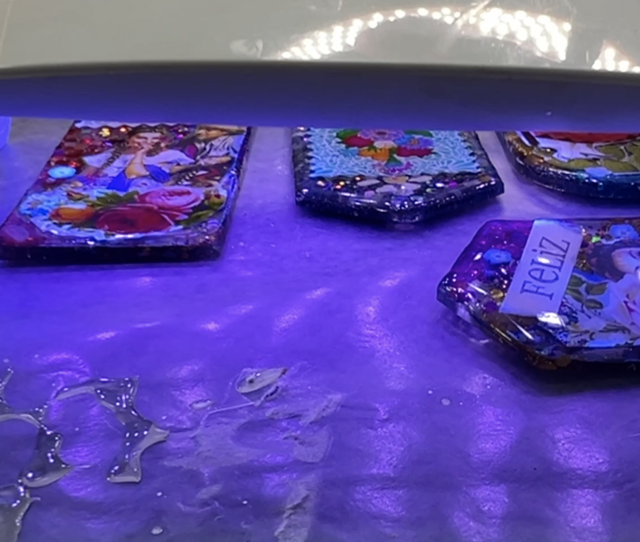 After you add the coat of UV resin, slide them to cure under a UV lamp. If using traditional two-part resin, add this last coat and let them cure for severla hours until fully hardened.